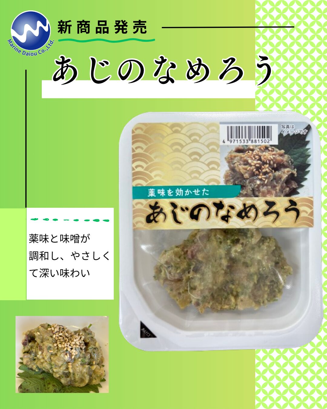 11月18日より、グループ会社・マリン大王の新商品 「あじのなめろう」 を発売いたしました。